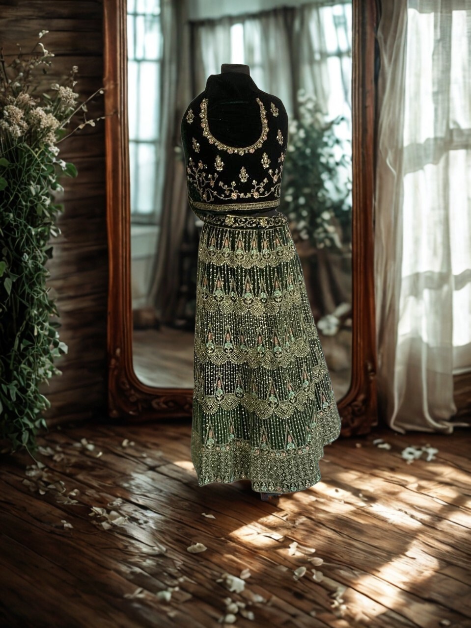 Emerald Green Velvet Embroidered Lehenga Set with Dupatta