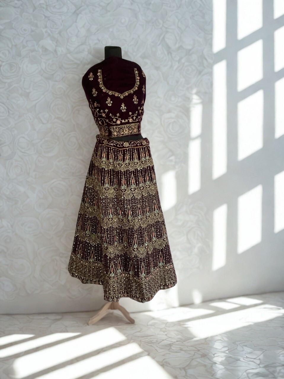 Maroon Velvet Embroidered Lehenga Set with Dupatta